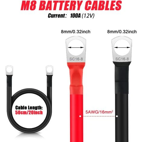 GRUPPO CAVO BATTERIA M8: Cavo batteria 50cm 5AWG calibro 12V composto da un set di poli batteria positivo (rosso) e negativo (nero) con cavi adatti per batterie in parallelo o in serie.