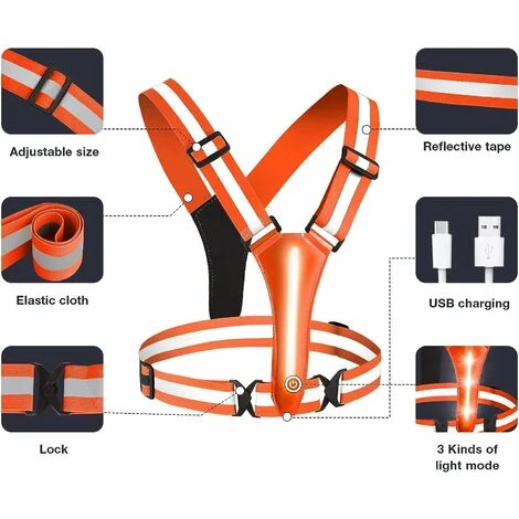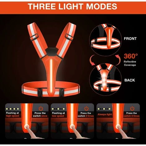 【Alta visibilità】: i nastri riflettenti a 360° attirare l’attenzione da tutte le direzioni di notte e garantire un’elevata visibilità. stato come l’inverno. Le tre modalità di illuminazione del gilet da corsa possono essere regolate in base alle tue esigenze: luce fissa, flash veloce e flash lento.