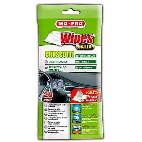 Salviette monouso per pulizia di cruscotti e plastiche auto. Dona protezione ed un effetto satinato. Le salvette Wipes Clean hanno il 30% in più di detergenti rispetto alle altre salviette monouso, per aumentare la resistenza e la pulizia.