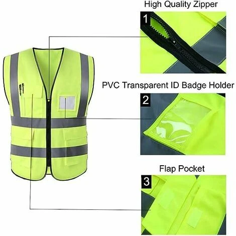 Tasche multifunzione: Gilet di sicurezza ad alta visibilità progettati con 5 tasche frontali con cerniere in nylon, 2 ampie tasche, 1 porta badge in PVC trasparente, 1 tasca con patta e 1 porta badge. puntatore laser.