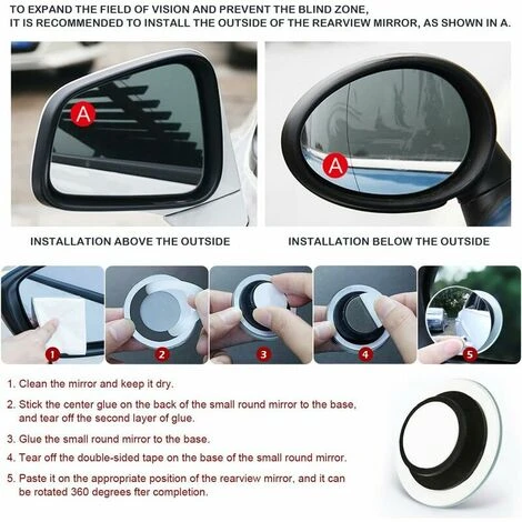 Confezione da 2 pezzi: regolazione della rotazione arbitraria a 360° e inclinazione, controllo per massimizzare l’angolo di visione. Punti ciechi ridotti. Garantire la sicurezza di guida.