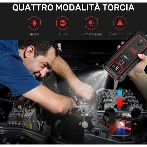 Starter batteria auto la luce a LED ha 4 modalità: torcia / strobo / SOS, che può essere utilizzata come strumento di emergenza. Inoltre ha una spia rossa che, in caso di incidente, può segnalare alle auto di passaggio.